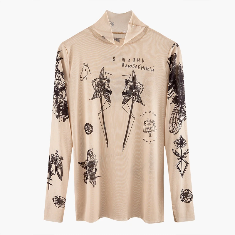 2019 Россия Осень Новая мода женский базальный Топ богиня тату принт Винтаж Высокие обтягивающие Воротник Сетка Пряжа Сексуальная футболка Т...