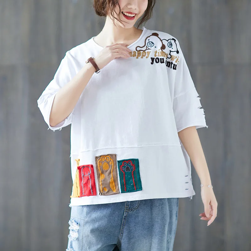Женские футболки с вышивкой Johnature, повседневные свободные универсальные футболки с принтом из мультфильма, 5 видов цветов, лето 2020