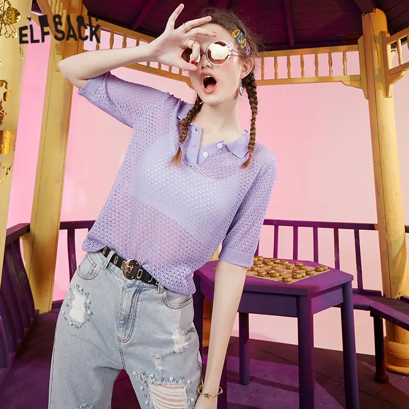ELFSACK/фиолетовая сплошная шикарная Джерси на пуговицах, Повседневная футболка, женская одежда, весна 2020, абрикосовый чистый рукав, Женская Повседневная Базовая футболка