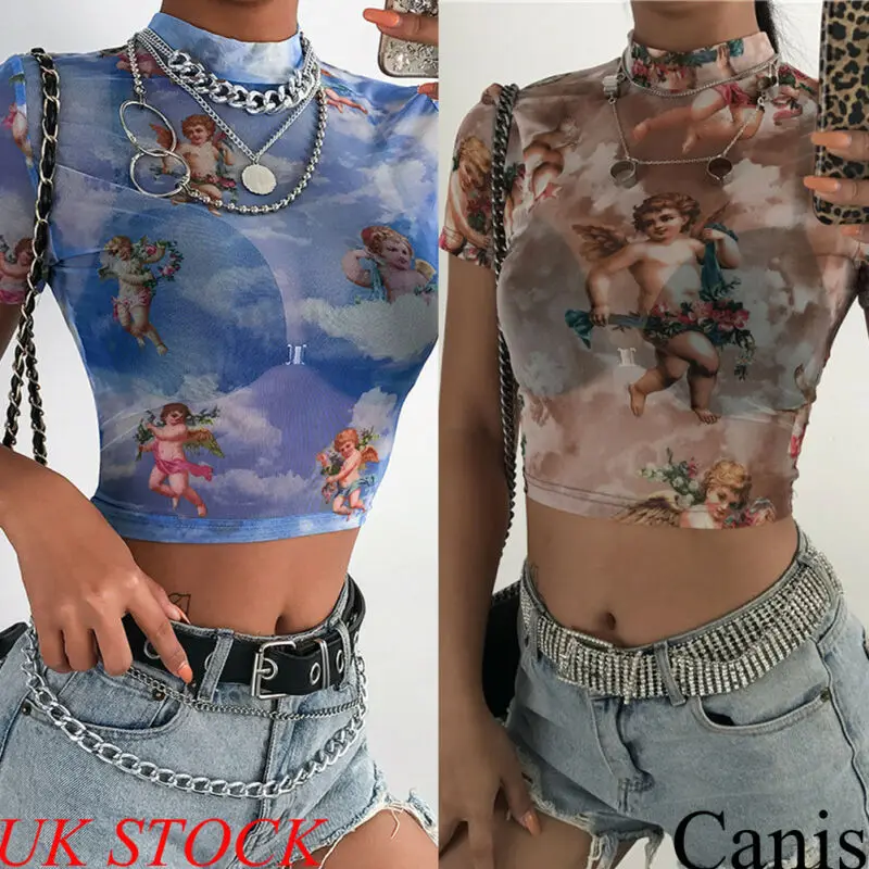 Женский прозрачный Цветочный ангел прозрачный укороченный мини-топ модная женская печать на прозрачной поверхности прозрачный укороченны...