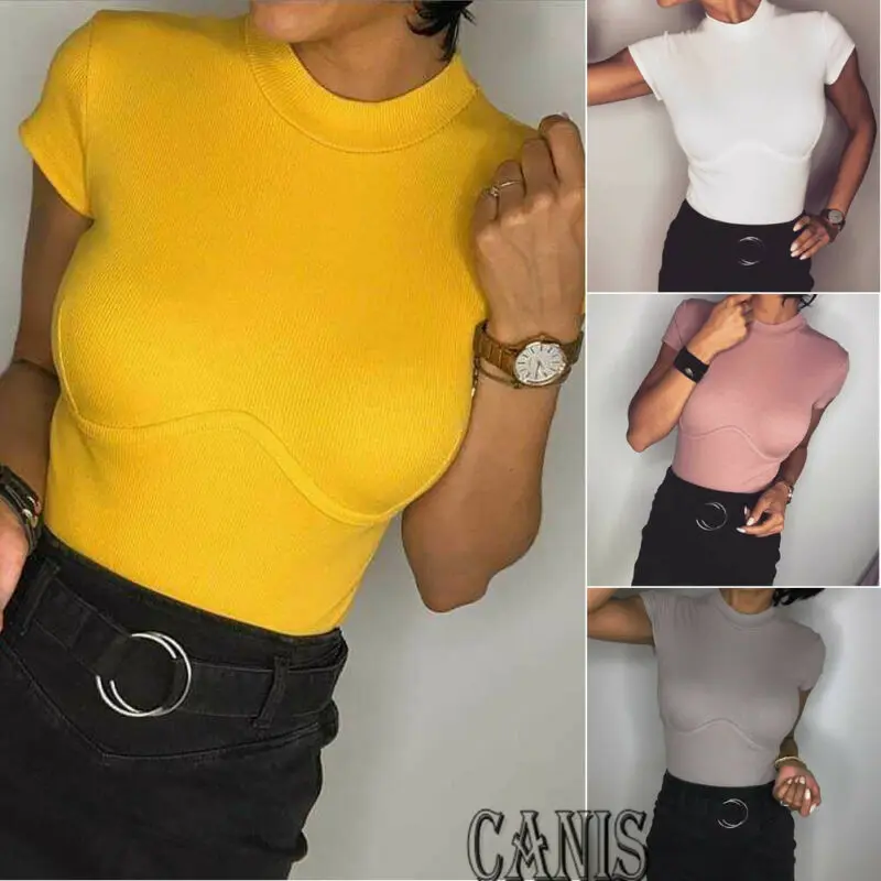 Женские футболки топы простые с высоким воротом короткий рукав сплошной цвет Топ сексуальный стрейч-Футболка модная летняя футболка Женск...
