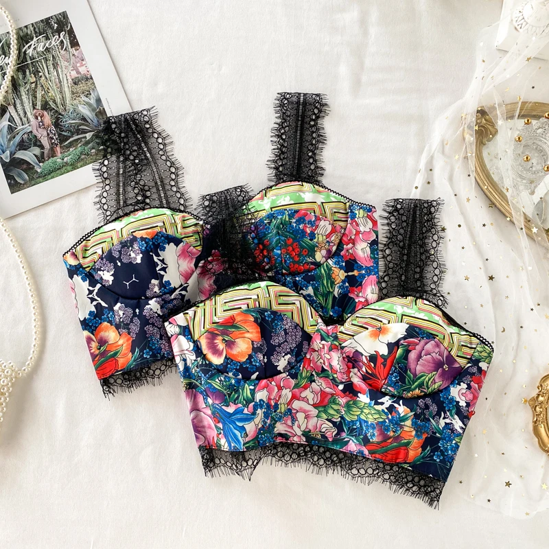 Ретро корт печати подвязки жилет для женщин сексуальный шик сладкий кружева сшивание короткие кроп Топы Леди без рукавов Бюстье Топы L403