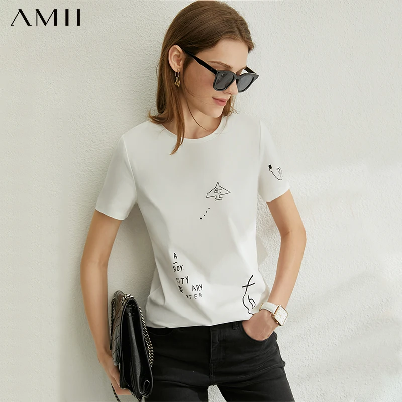 AMII минимализм весенне-Летняя женская футболка с принтом Топы повседневные с круглым вырезом с короткими рукавами свободные женские футболки 12070232