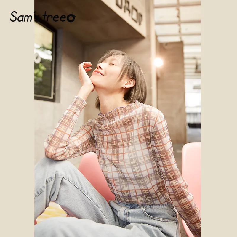 SAM'S TREE/фиолетовая клетчатая повседневная женская футболка с оборками на воротнике, весна 2020, золотистый однотонный сетчатый женский облегающий топ с длинными рукавами в Корейском стиле