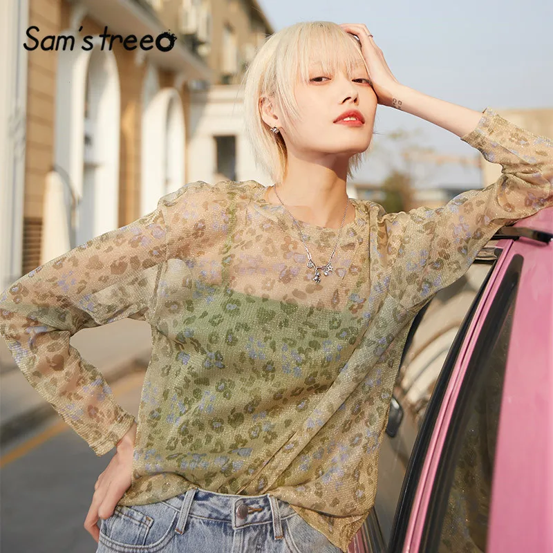 SAM'S TREE зеленый Леопардовый принт сексуальные женские футболки 2020 Весна золотые буквы в горошек с длинным рукавом Повседневные женские топы ...