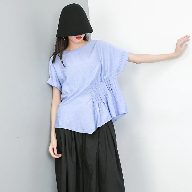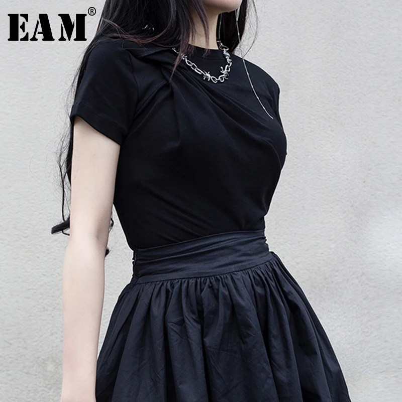 [EAM] 2019 Новинка Весна Лето круглый вырез короткий рукав Черный Асимметричный плиссированный сплит-соединение большой размер футболка женск...