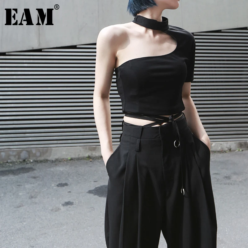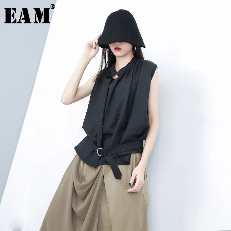 [EAM] 2019 Новинка весна лето стоячий воротник без рукавов белая лента сплит-соединение свободные Индивидуальные топы на бретелях Женская мода ...