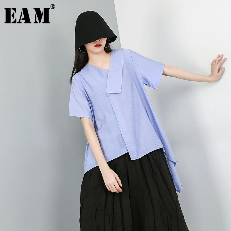 [EAM] 2019 Новинка весна лето v-образным вырезом короткий рукав черный Свободный асимметричный подол свободный темперамент футболка женская мо...