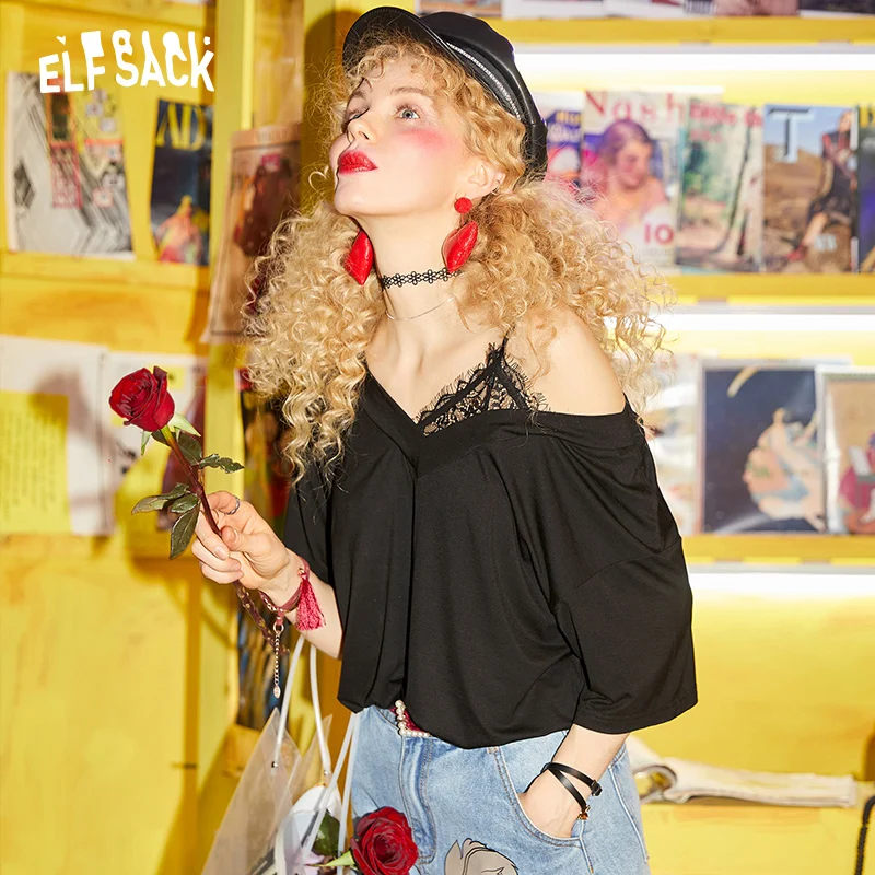 Эльф МЕШОК сплошные кружевные лоскутные Для женщин топы Стильный v-образным вырезом основе футболки женские футболки 2019 новые летние пикан...