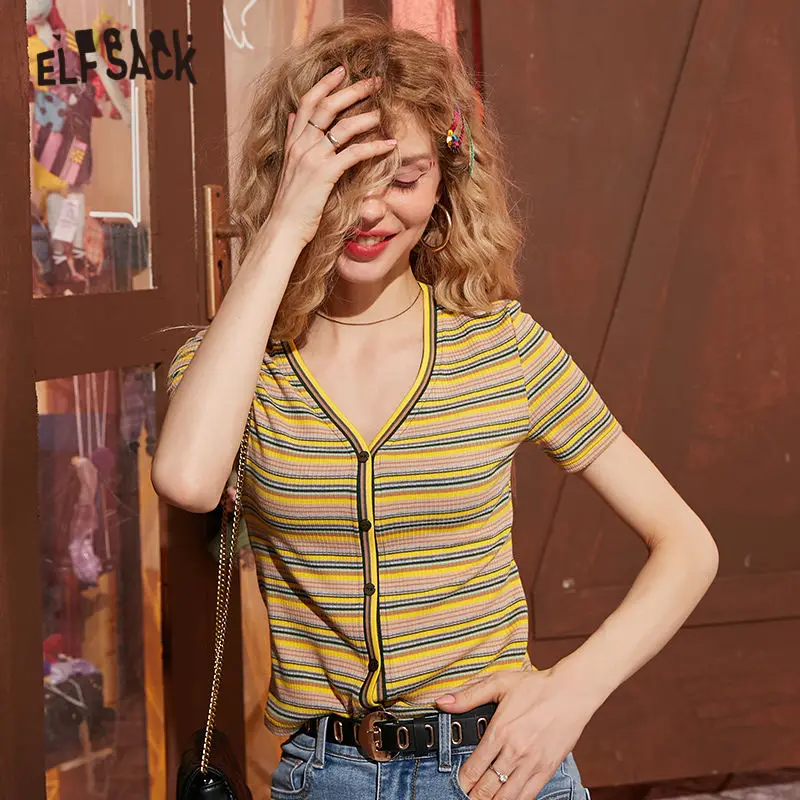 ELFSACK/розовые цветные полосатые тонкие повседневные женские футболки, весна 2020, новые цветные корейские женские повседневные топы с коротким рукавом