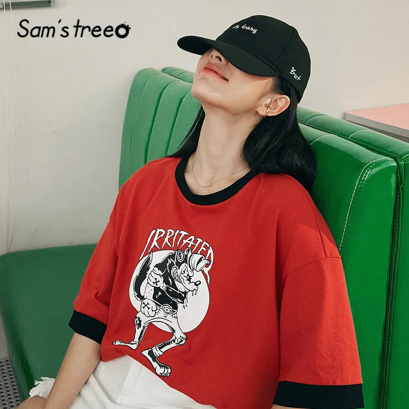 Женские повседневные трикотажные футболки с принтом SAM'S TREE, красные повседневные корейские Топы с коротким рукавом и разрезом по бокам, 2020