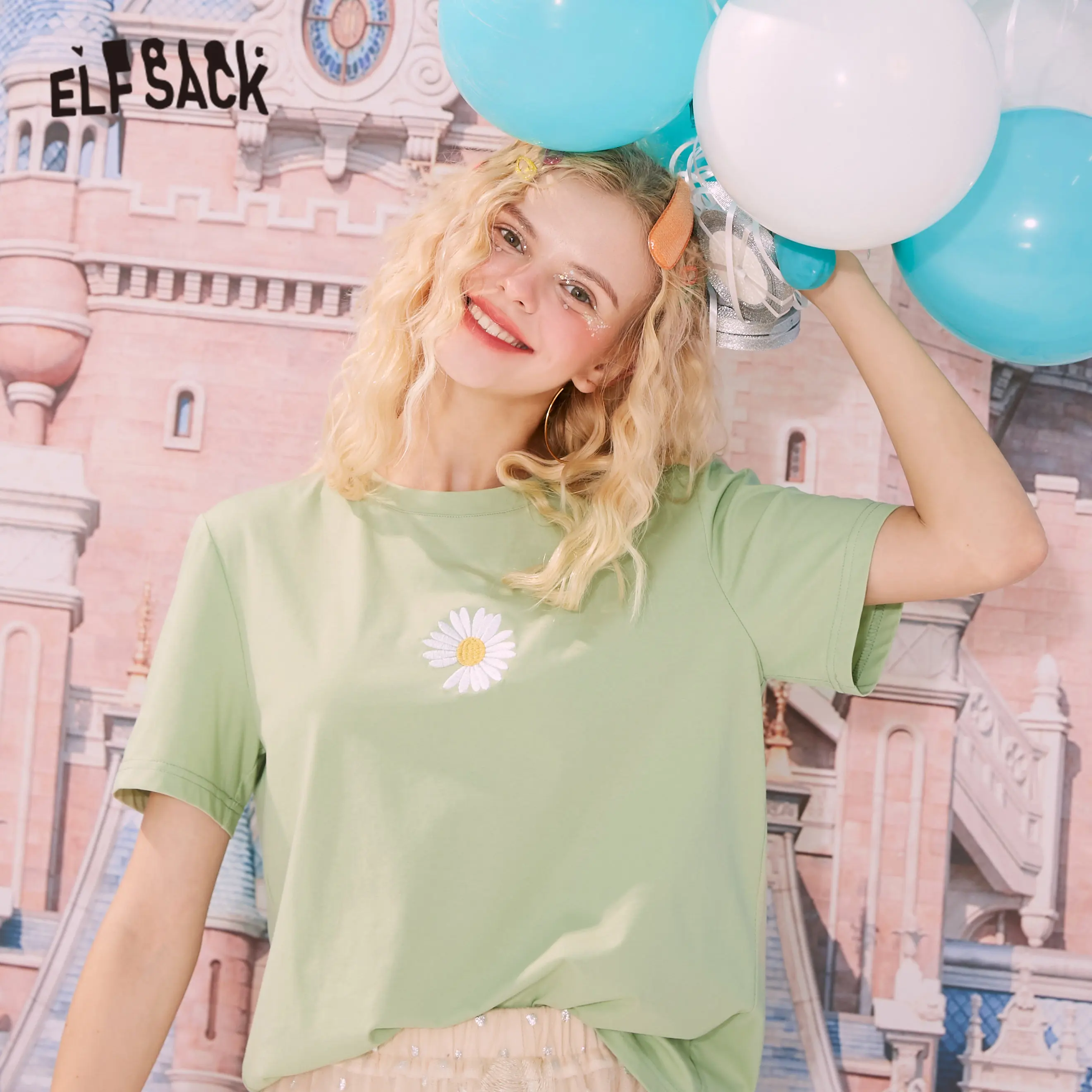 Elfsack Футболка с принтом мороженого твердые цветы ромашки вышивка Повседневное футболки Для женщин 2020 летнее бело-серые короткий рукав в Корейском стиле женские повседневные топы
