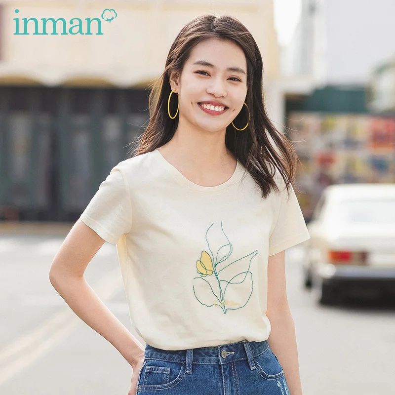 INMAN 2020 Лето Новое поступление Чистый и свежий круглый воротник чистый хлопок вышитая Футболка с коротким рукавом