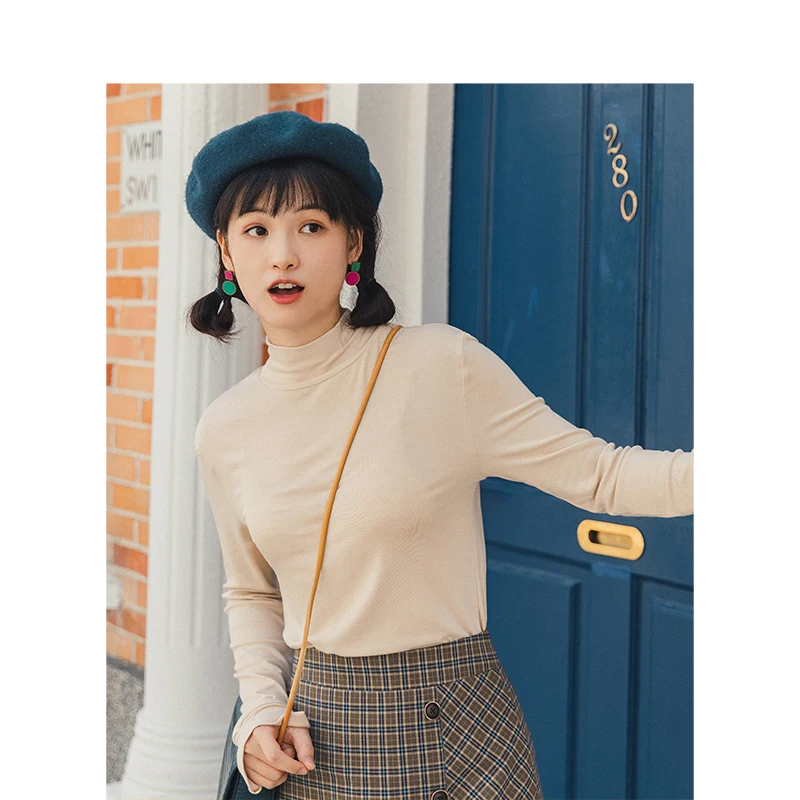 INMAN, весна 2020, Новое поступление, Ретро стиль, одноцветная, высокий воротник, тонкая, подходит ко всему, длинный рукав, вязаная женская футбол...