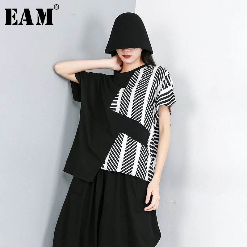 [EAM] 2019 новая весенне-летняя футболка с круглым вырезом и коротким рукавом в черную полоску с разрезом, свободная футболка большого размера Ж...