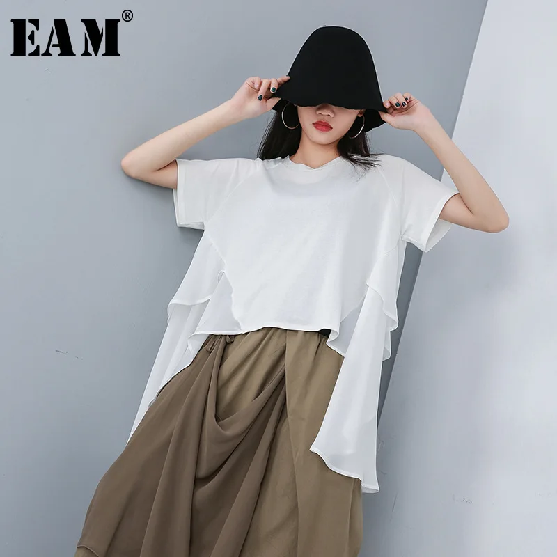 [EAM] 2019 Новинка Весна Лето круглый вырез короткий рукав белая спина Длинный свободный шифон большой размер футболка женская Мода Tide JT176