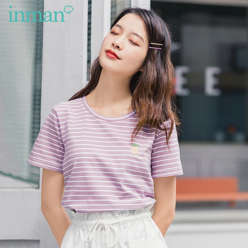 INMAN 2020 Summer New Arrival Fruit Pattern Embroidery Round Collar Contrast Color Stripped Causal All Matched T-Shirt