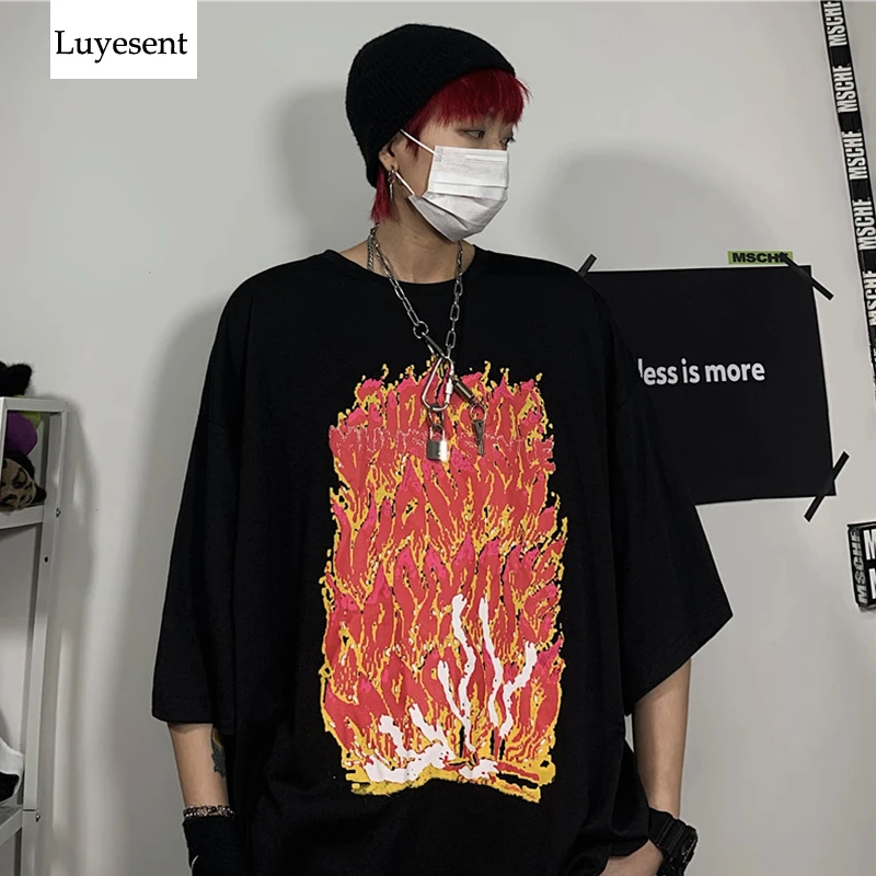 Harajuku крутые футболки унисекс с пожарным принтом 2020 женская уличная свободная Базовая футболка мужская хип-хоп Рок Черный Белый Повседневный Панк Топ