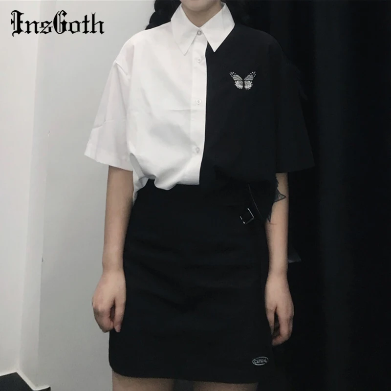 InsGoth Harajuku Partchwork футболки Готический летний женский кардиган с лацканами футболка бабочка вышивка шикарный гранж женские топы