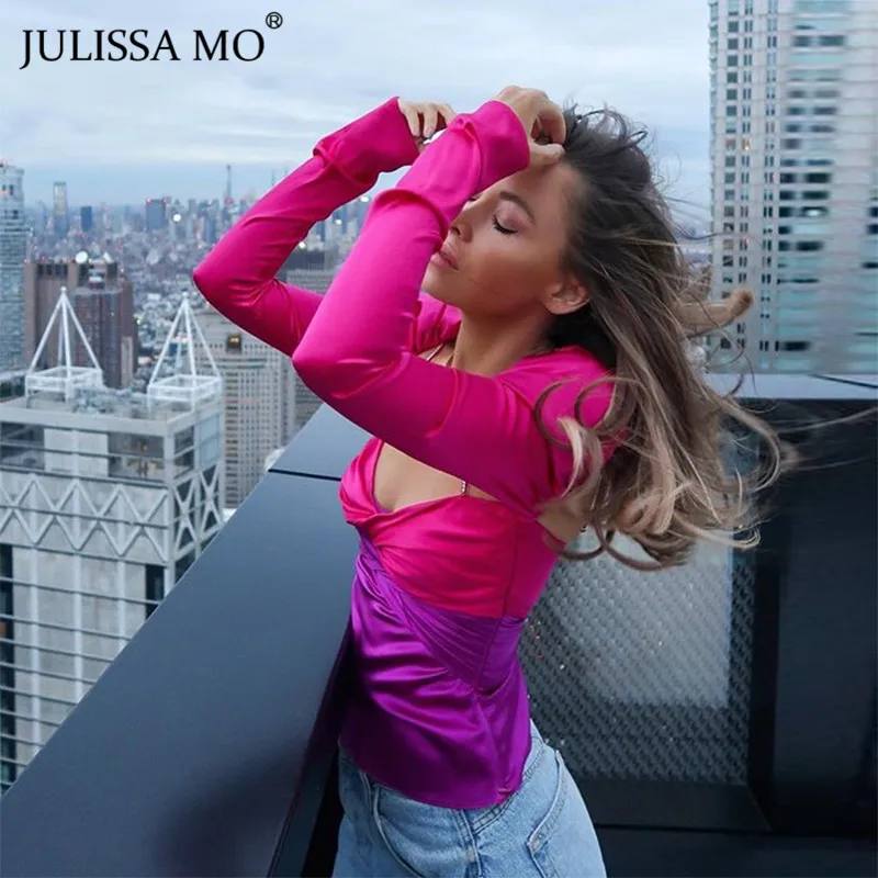 Julissa mo, шелковая Лоскутная Блузка с крученым передом, топ, Женская Сексуальная футболка с квадратным вырезом и длинным рукавом, женские стра...