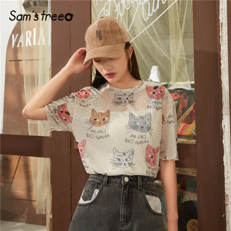 SAM'S TREE/белые повседневные женские прозрачные футболки с принтом кота, весна 2020, новые корейские женские повседневные милые тонкие Топы с коротким рукавом