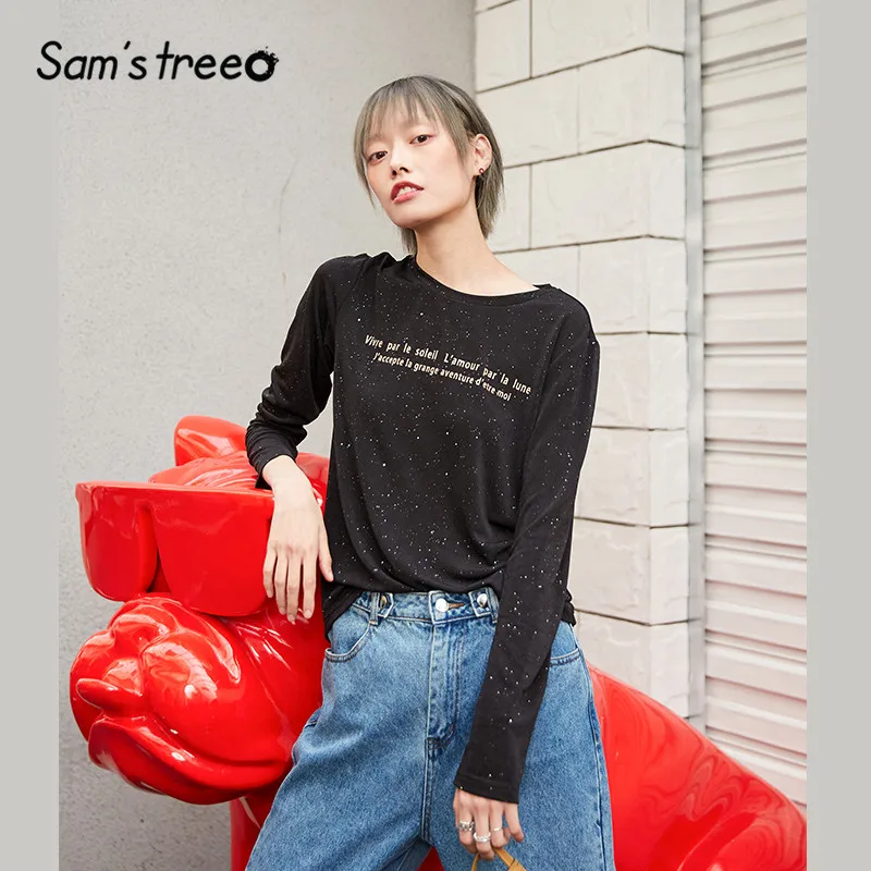 SAM'S TREE/черные однотонные яркие женские футболки с буквенным принтом, весна 2020, новые корейские повседневные женские базовые Топы с длинными рукавами