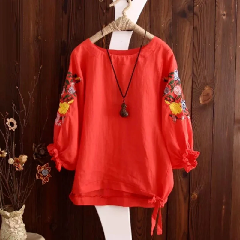 Женские повседневные футболки размера плюс, новинка 2020, летний винтажный стиль, Цветочная вышивка, 100% хлопок, женские свободные топы, футболки P302