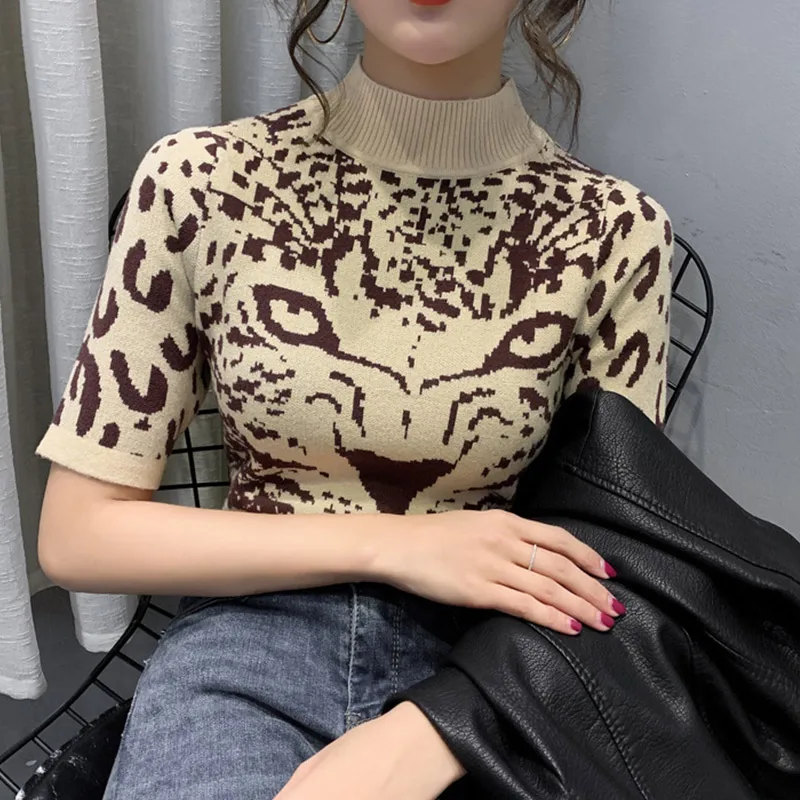 Футболка с принтом тигра, женская трикотажная футболка в рубчик с коротким рукавом, женские футболки 2020, весенне-летние футболки с высоким воротником для женщин