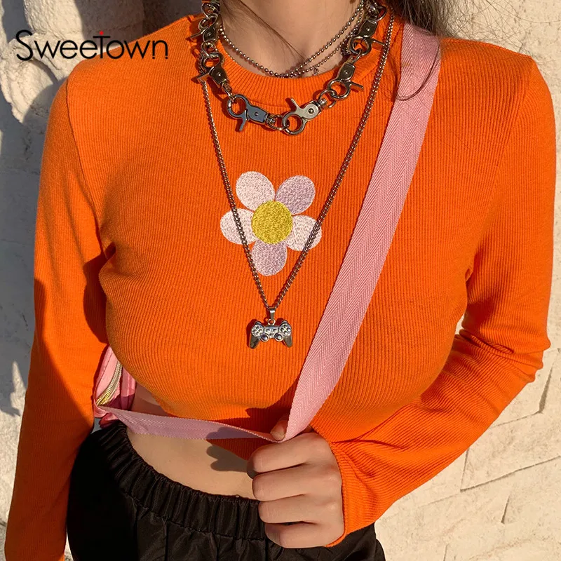 Sweetown цветочный принт милый короткий топ с длинным рукавом Осенние футболки женские оранжевые с круглым вырезом Повседневная Базовая уличн...