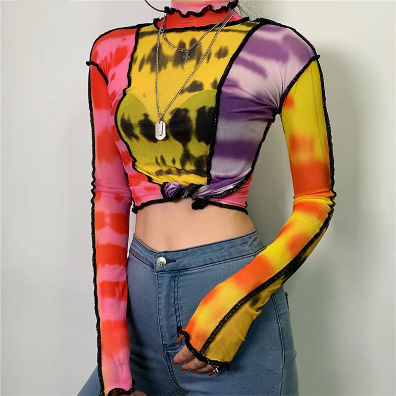 Модная футболка с принтом в виде галстука-красителя, женские сетчатые топы с высоким воротником и длинными рукавами, дышащие облегающие Женские вечерние Клубные футболки, уличная одежда