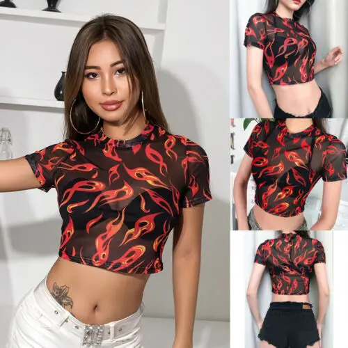 Сексуальная летняя женская футболка с коротким рукавом с вырезом лодочкой прозрачная сетчатая Прозрачная Футболка с принтом ангела пламен...