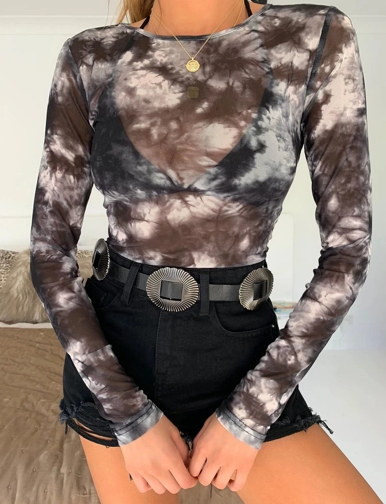 Прозрачная сетчатая Прозрачная Футболка, топы для женщин, с длинным рукавом, Прозрачный цветочный принт, короткая футболка, укороченный топ, Солнцезащитная футболка