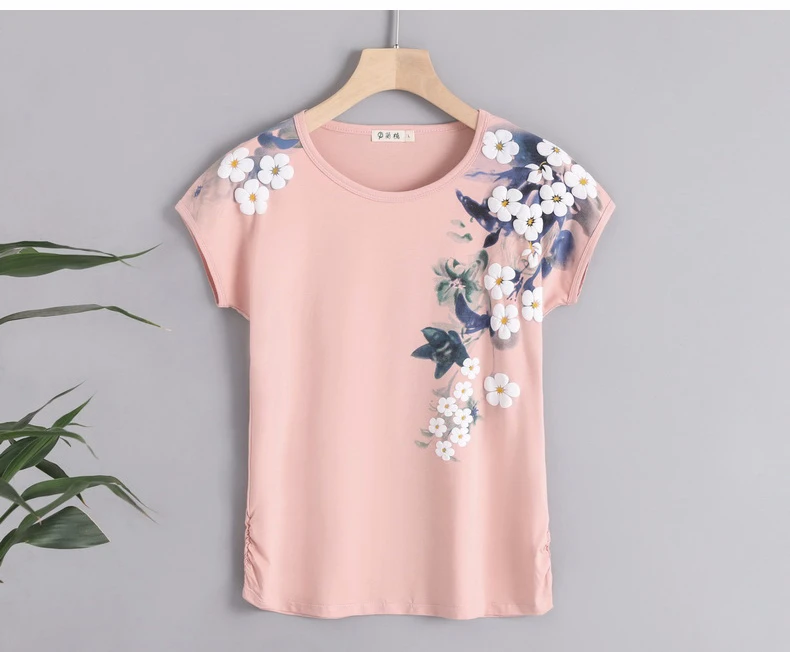 Женские жемчужные футболки с аппликациями 3D, топы с бисером и круглым вырезом, женская футболка с коротким рукавом, весна-лето 2020, повседневные свободные женские футболки