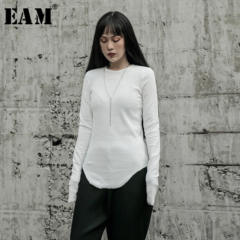 [EAM] Женская белая короткая футболка с круглым вырезом и высоким эластичным подолом, новая модная футболка с круглым вырезом и длинными рукавами, весна-осень 2020 1R599