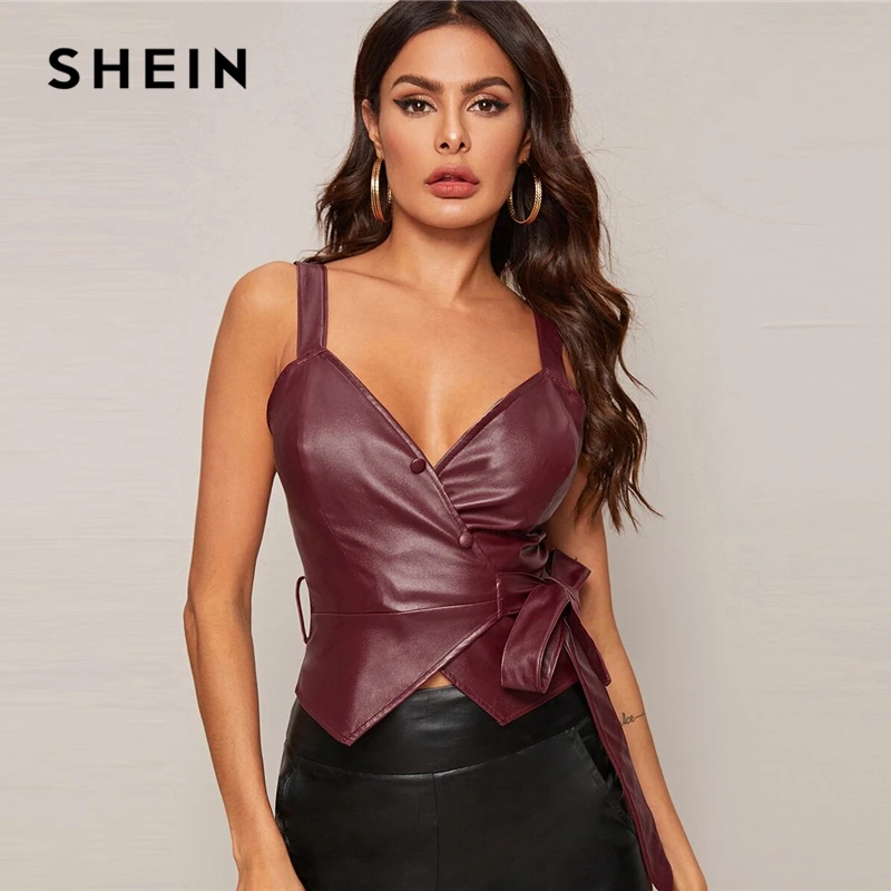 SHEIN Бургундия с запахом узел сторона из искусственной кожи сексуальная майка для женщин топы корректирующие весна без рукавов Твердые пуговицы дамы Гламурные