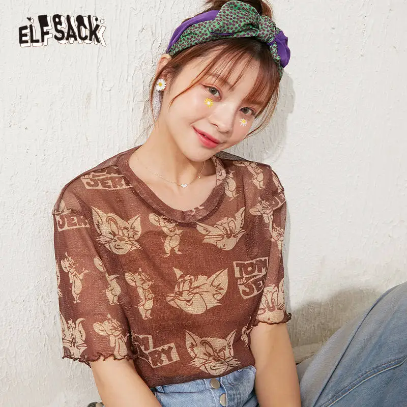 Elfsack забавный графический принт Повседневное Fishinet сетчатые футболки Для женщин топ 2020 летние бело-серые Прозрачное нижнее белье в Корейском стиле женские повседневные милые топы