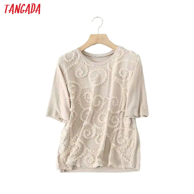 Tangada Женская винтажная 3D вышивка 2020 футболка с коротким рукавом и круглым вырезом женские элегантные офисные Топы 5B09