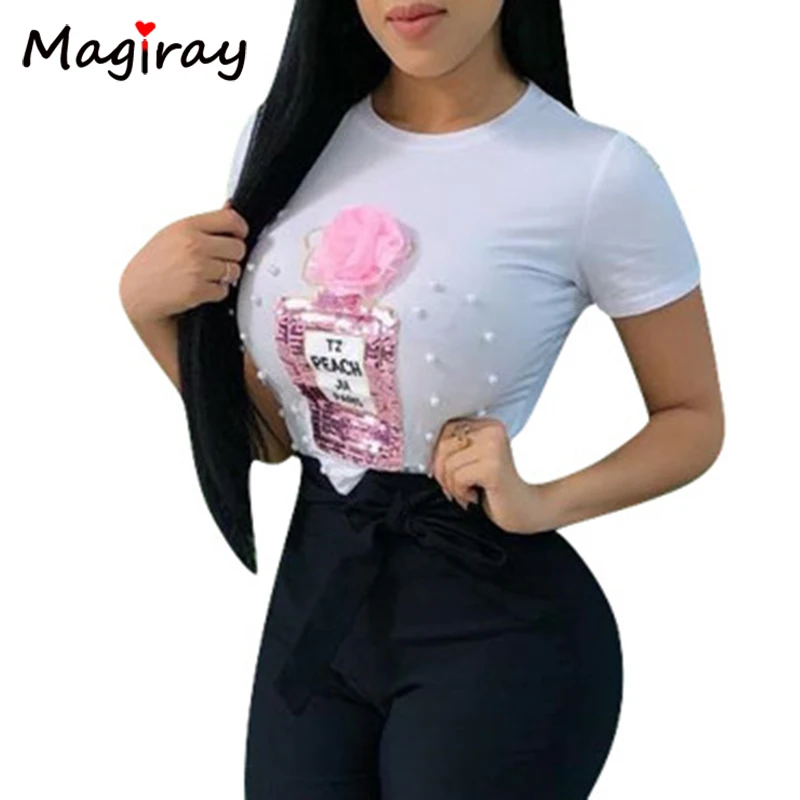 Крем духи сексуальные футболка Для женщин 2019 Лето Harajuku корейский Забавный блестками Бисер футболка Женские уникальные белые топы C123