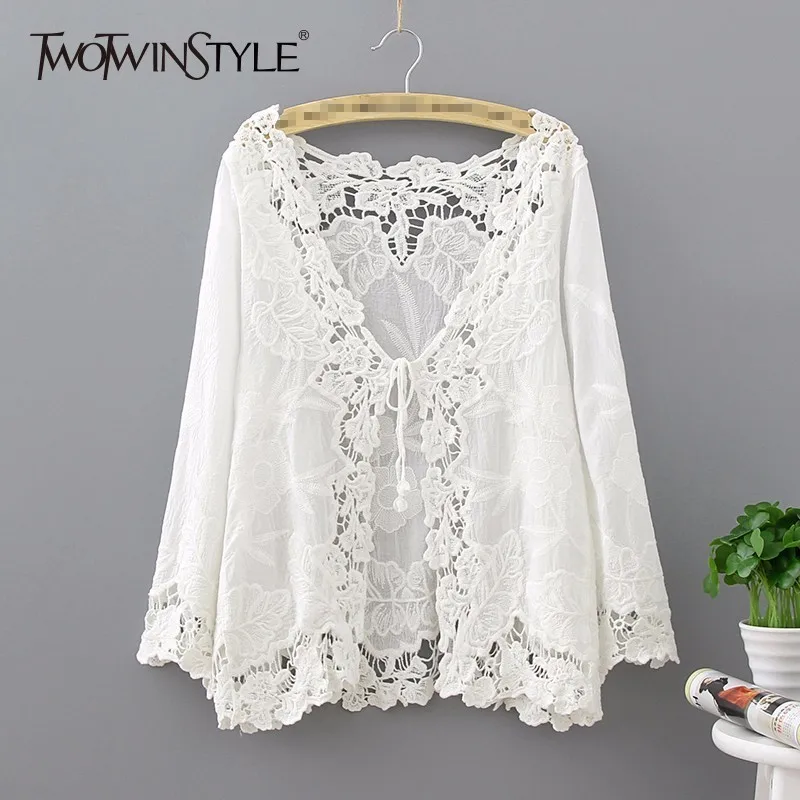 Twotwinstyle футболка с цветочным принтом женские Кружево Up выдалбливают с длинным рукавом Весенние белые футболки 2018 мода новый большой Размеры...
