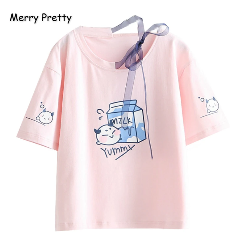 MERRY PRETTY, Хлопковые женские футболки на шнуровке с мультяшным принтом, летняя футболка с коротким рукавом и круглым вырезом, Harajuku, базовые топ...
