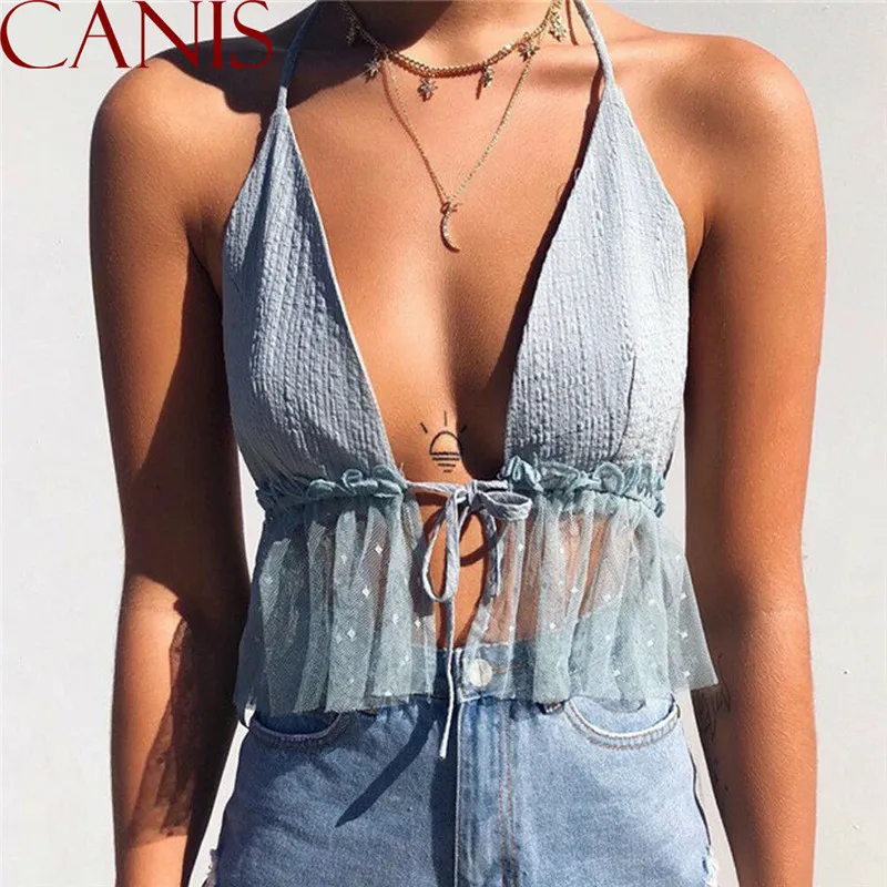 Новые женские Camisole синий Повседневный тонкий Холтер с глубоким вырезом Sheer Mesh panel Chic Cami Crop Tops 3FS