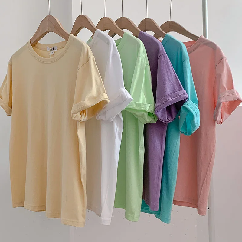 Свободная цветная футболка с короткими рукавами, летняя Базовая футболка с коротким рукавом и круглым вырезом, топ фиолетового размера плюс, корейские топы, пуловер