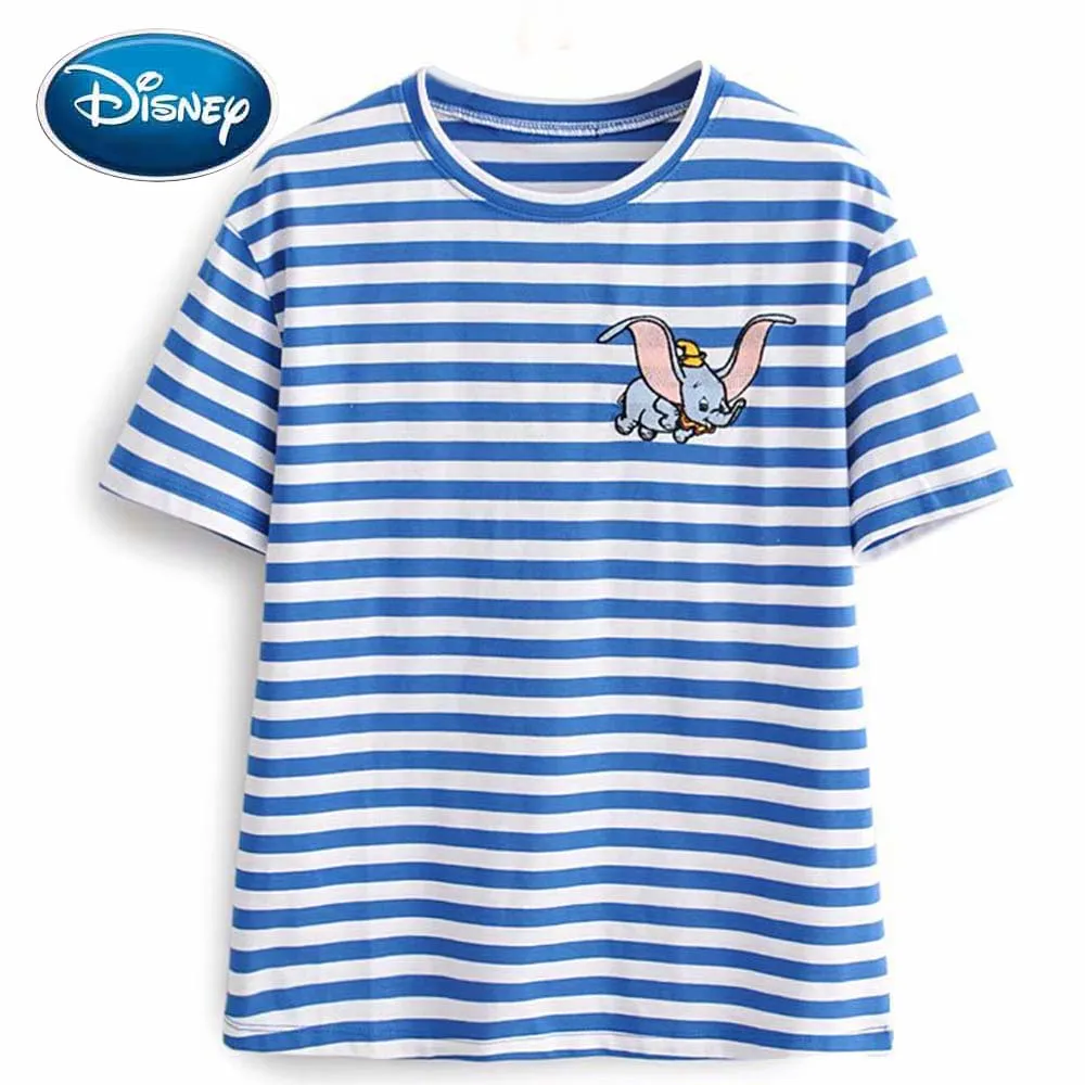 Дисней ШИК Мода Дамбо слон мультфильм печати вышивка o-образным вырезом Пуловер короткий рукав женская футболка свободные полосатые футболки топы