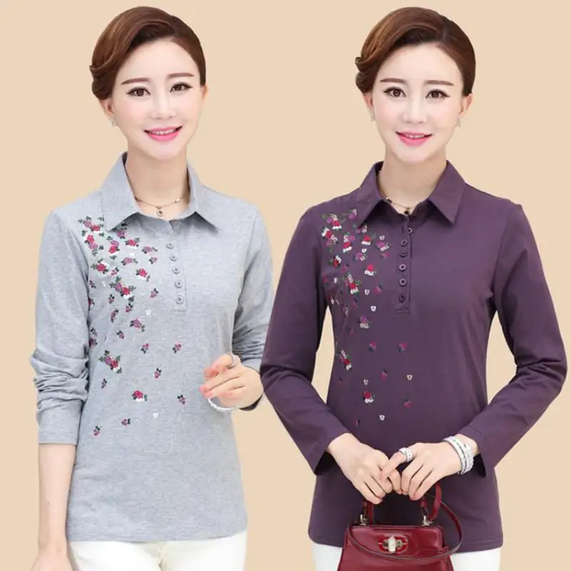 YAUAMDB женская рубашка поло весна осень размер L-4XL хлопок Женская вышитая Футболка с длинным рукавом женская рубашка поло с отложным воротником 46