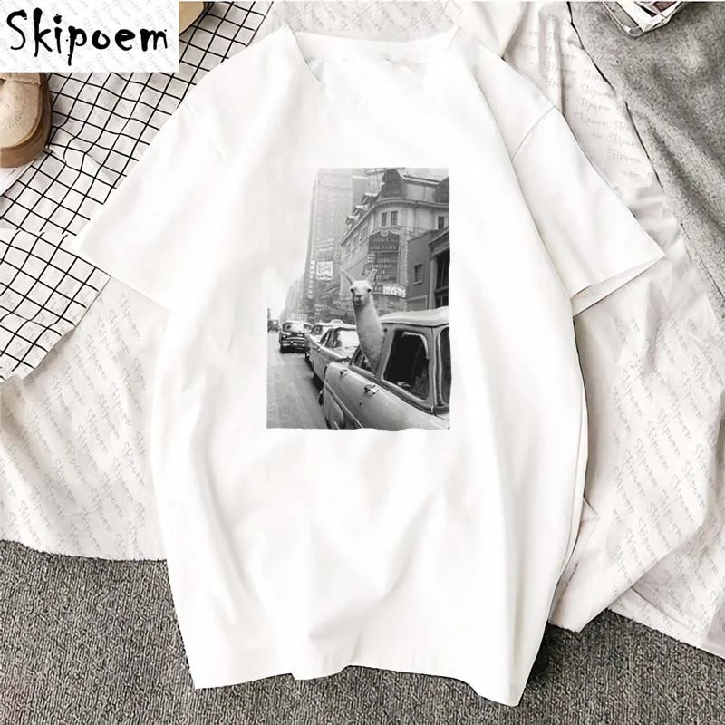 Модная футболка с короткими рукавами, лама в такси на Таймс-сквер, 100% хлопок, футболки, повседневная футболка с круглым вырезом, футболка уни...