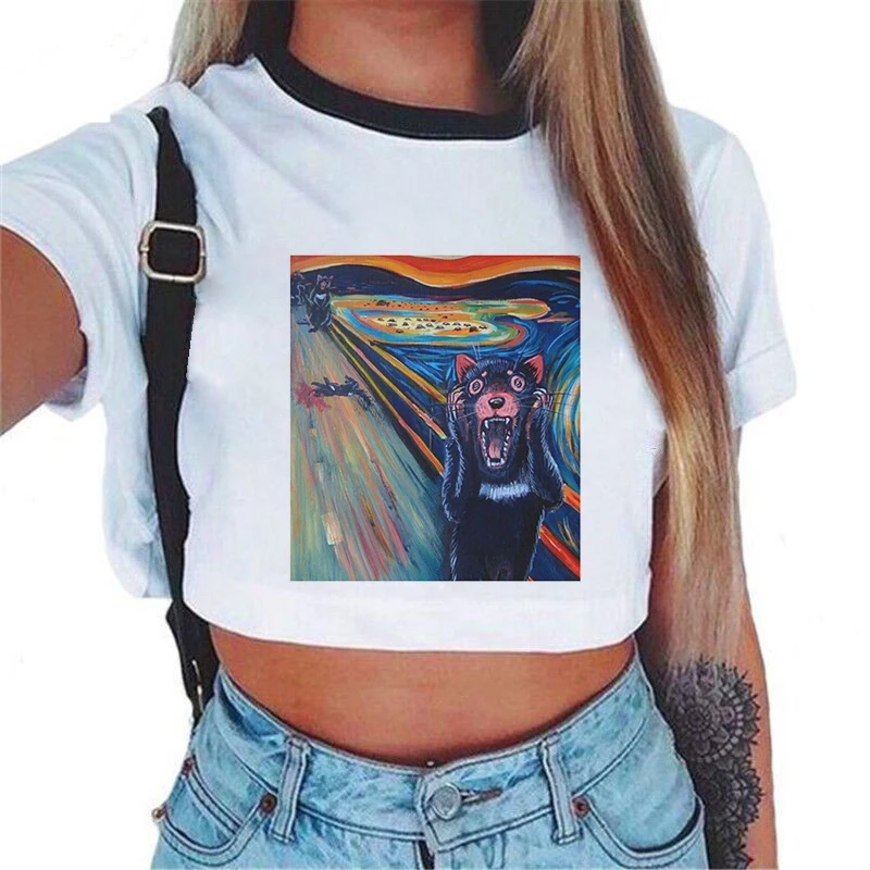 Летний укороченный топ, женская футболка, известная живопись, кричащие пряники, Улица Сезам, печенье, монстр, пародия, женская футболка