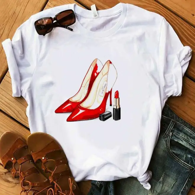 Красная футболка на высоком каблуке, Женская Роскошная футболка в стиле Парижа, женские летние короткие топы, хипстерские футболки для девочек