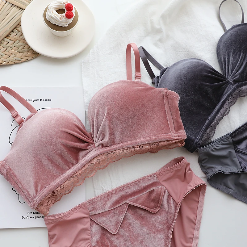 Новое розовое бархатное женское нижнее белье, сексуальный романтичный кружевной комплект с бюстгальтером, благородный женский комплект с ...