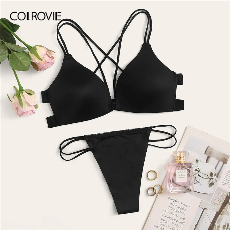 COLROVIE, черный комплект нижнего белья с перекрещивающимися крест-накрест, женское нижнее белье, закрытое спереди, 2019, однотонный Беспроводной Сексуальный комплект, Женский комплект с бюстгальтером