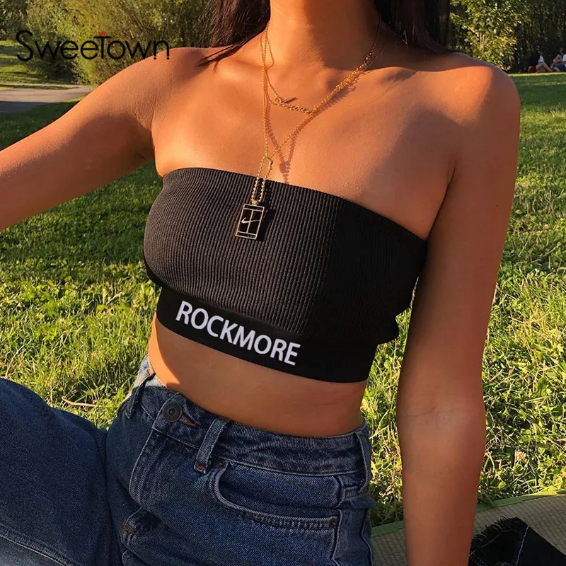Sweetown повседневный летний топ-труба Женская пляжная одежда с буквенным принтом Топ-бандо без бретелек с открытыми плечами Сексуальная черна...